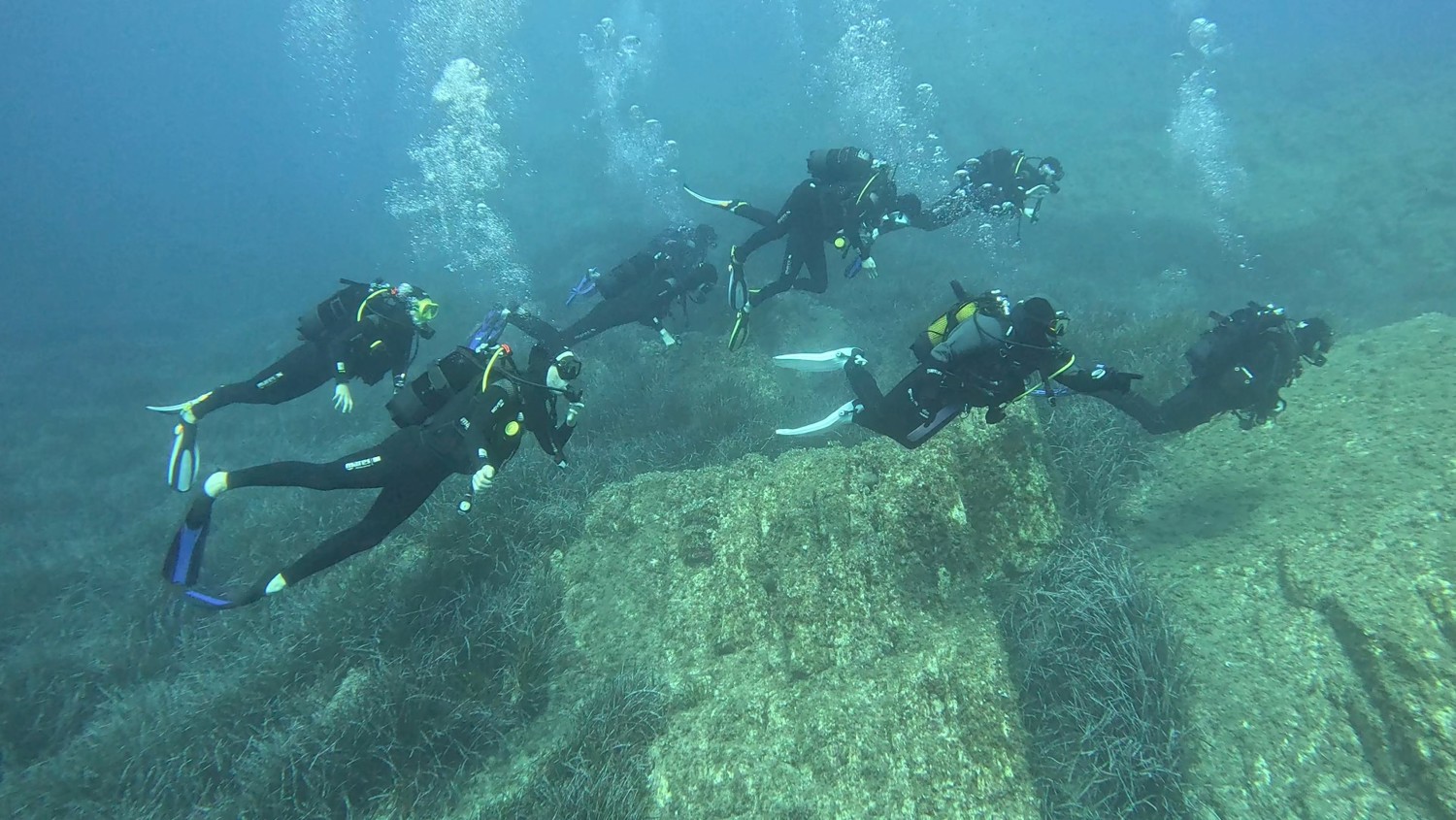 Vi dykker hver dag to gange ad 2 timer på nogle fede dykkersteder, hvor vi har kunne dykke mellem og under store sten. Vi har også badet på flotte hvide sandstrande fyldt med æstetiske strandcaféer, shoppet i byen og udforsket Calvi. Om aftenen er der fyldt med liv og vi har spist alt fra lokalt vildsvin til italienske pizza'er og alt godt fra havet.